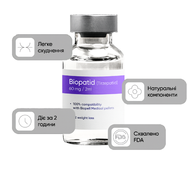 Як це працює? Біопатид розроблений на основі формули Мунджаро та імітує дію природних гормонів кишківника (GLP-1 та GIP). Ці гормони сигналізують мозку про насичення та регулюють рівень цукру в крові. У пацієнтів з надмірною вагою та метаболічними порушеннями знижується апетит, а організм краще засвоює поживні речовини.